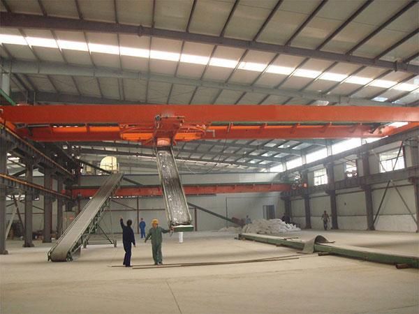结构上通过大行车的纵向行走和小行车的横向行走及升降输送机的升降和旋转,确保码垛机在库房任意位置进行堆包码垛。